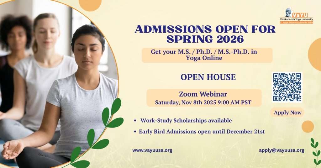 Welcome to VaYU’s Online Open House for the Spring 2026 semester, which begins Jan 12th, 2026. Please join us to enjoy a highly informative session to shape your future with an online M.S/Ph.D. in Yoga Philosophy, Yoga Therapy, Yoga Research. You can enjoy VaYU’s online programs at your own pace, at any place, and at any time. We look forward to seeing you at the Open House!