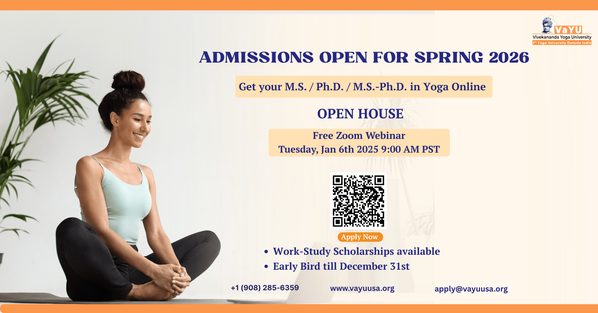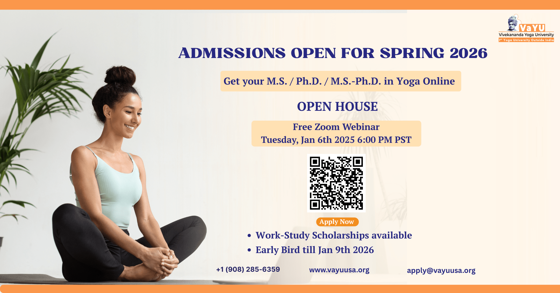 Register for the Zoom webinar by clicking here. VaYU, the 1st Yoga University outside India with online M.S./Ph.D. programs welcomes you to apply for Spring 2026 with Spring semester starting January 12th […] |